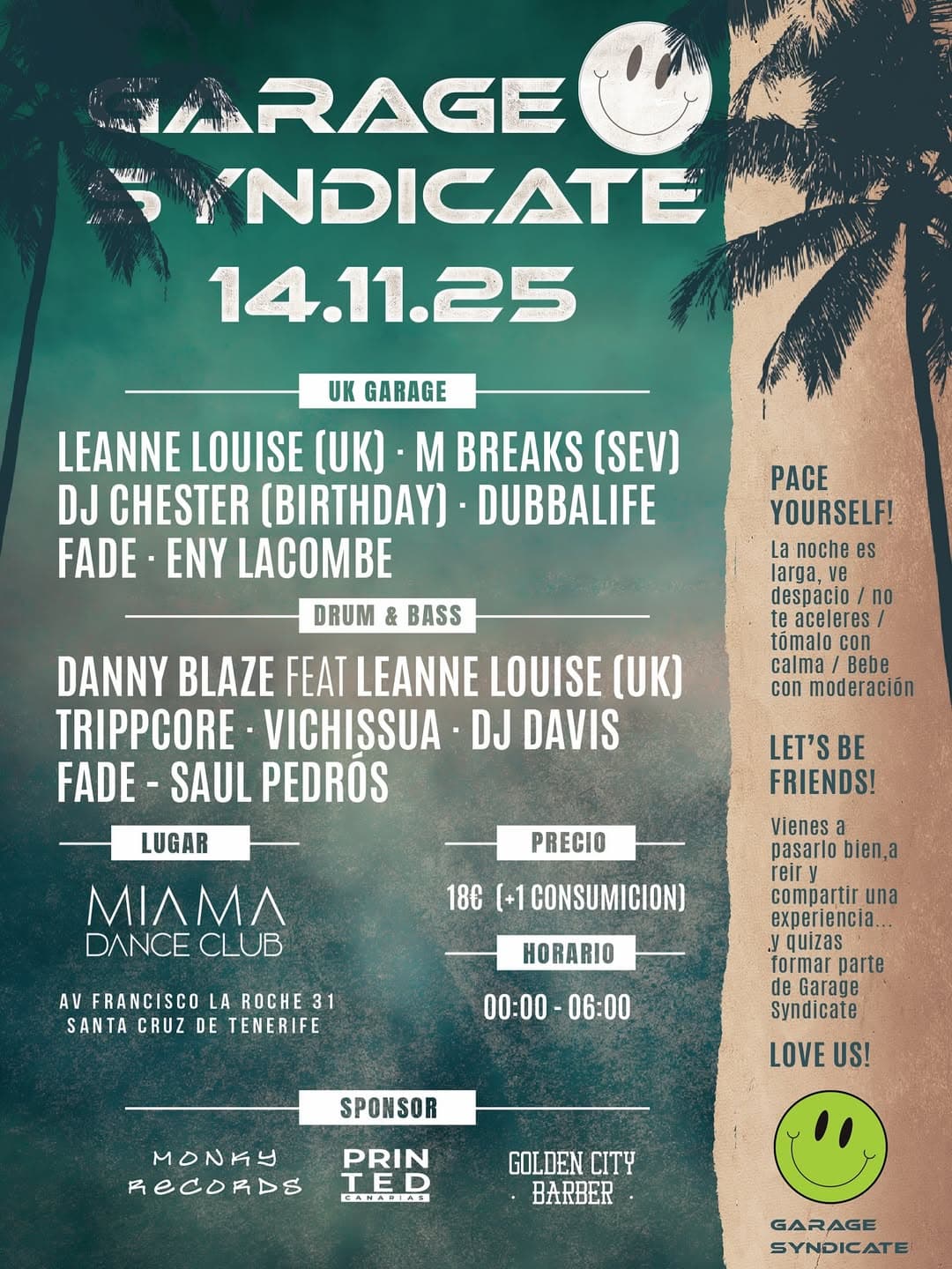 Tenerife vuelve a vibrar con la auténtica cultura de club. Garage Syndicate celebra su tercera edición, consolidándose como el punto de encuentro para quienes buscan sonido real, energía pura y conexión en la pista. Prepárate para una noche dedicada al 2Step, Bassline y Speed Garage, con un cartel que une técnica, vinilo y pasión: